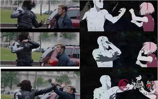 比如有网友指出《博人传》动画第23集,涉嫌对《美国队长2》的部分打斗场景抄袭,并进行了重叠比较。