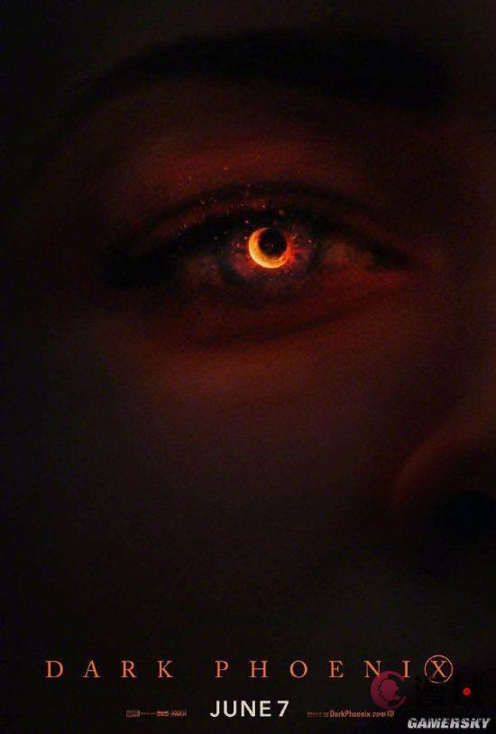 画面特写了凤凰女琴·葛蕾的小半边脸,琴的瞳孔设计成了与黑洞图片相似的样子,整张海报颜色昏暗,只有黑洞瞳孔发出橙黄的光芒。