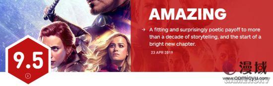 IGN为《复仇者联盟4》打出了9.5分的高分,评测者认为漫威为一段10多年的故事画上了一个诗意的句点,结局既恰当又令人惊讶,另外这也是一个崭新篇章的开端。