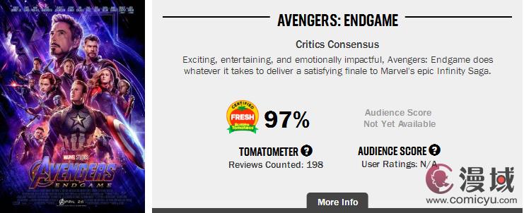 截止发稿时,《复仇者联盟4》的烂番茄新鲜度达到了97%,192新鲜6烂,媒体评价相当之高。