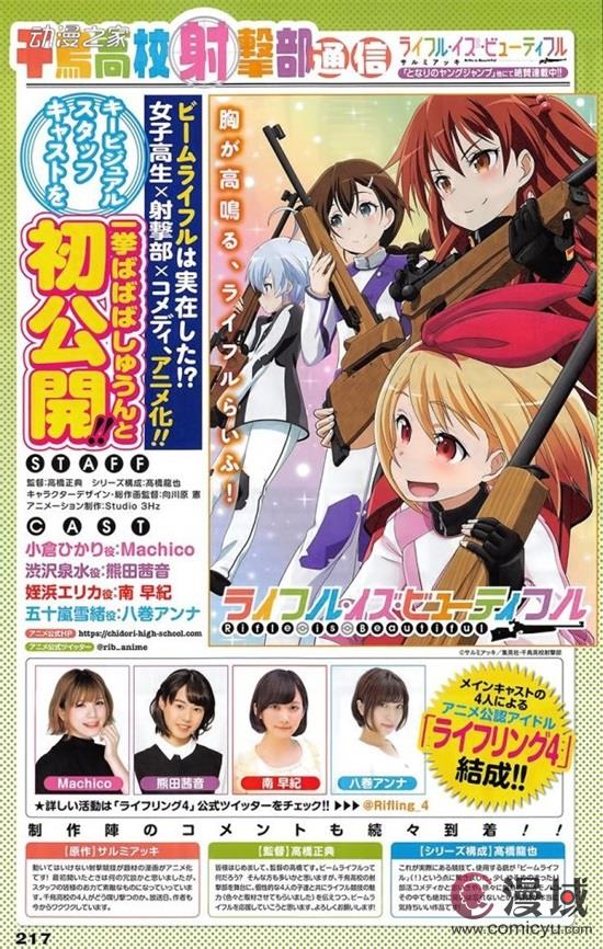 在之前宣布动画化的《Rifle is Beautiful》公开主宣传图、STAFF、CAST等消息。从图片中可以看到,本作是由制作过《天体的秩序》、《刀剑神域 Gun Gale Online》等作品的Studio 3Hz。高桥正典担任导演,高桥龙也担任编剧,向川原宪担任角色设计与总作画导演。Machico、熊田茜音、南早纪和八卷安奈分别为四名主要角色配音。