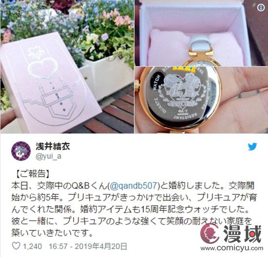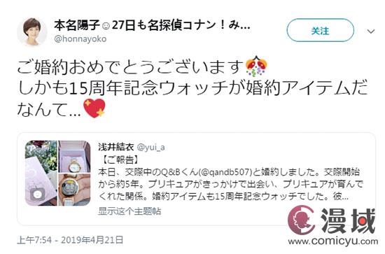 意外的是,初代《光之美少女》中美墨渚的声优本名阳子在次日夜里为她送上了:“恭喜订婚?订婚信物竟然是15周年纪念表啊...?”这样的祝福。