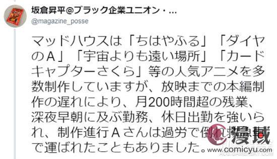 坂仓昇平是一位专门推动劳动改进政策,并且帮助劳工争取权益的活动家,他在这个月初宣布将会帮助一位在动画公司MADHOUSE担任“制作进行”的某A争取改善劳动环境立刻引发话题,从他爆料的内容当中可以得知MADHOUSE的劳动环境真的非常要命。
