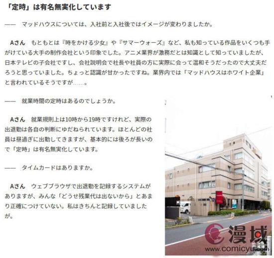 “进公司之前还听说MADHOUSE在业界算是好公司,之后才发现明定的上班时间有名无实,说是10点到7点但是大家都中午过后才来,通常也不知道什么时候才可以下班,大家甚至还说反正没有加班费所以连上下班纪录都随便填写,随然我还是会正确填写啦。”