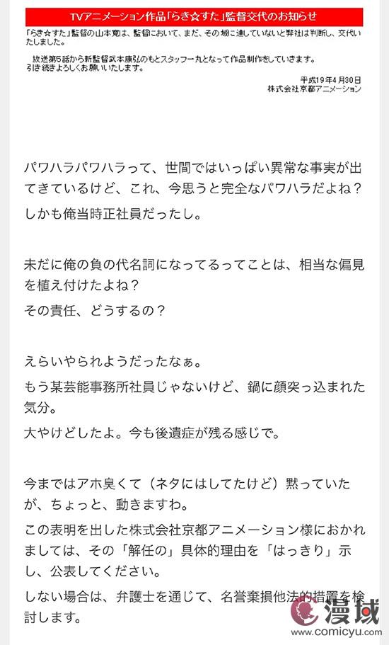 山本宽要求京都动画清楚说明,当年动画《幸运星》放送后没几话就让山本宽不再担任监督的原因,否则山本宽就要找律师考虑以损害名誉为由对京都动画采取法律措施。
