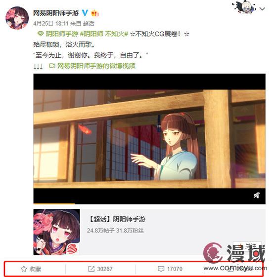 截止发稿前,不知火CG预告+正片全网播放量近千万,两篇微信文章阅读量均达10万+,两条微博互动总量达11万+、 #阴阳师不知火#微博话题阅读量已达1.7亿。