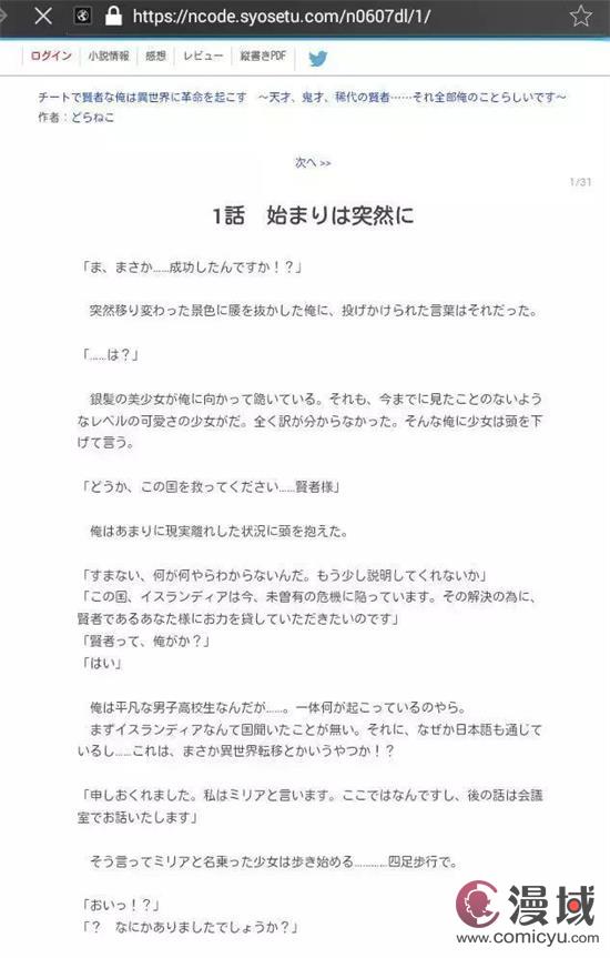 但其实说到惊为天人的弱智穿越作品,《贤者之孙》其实还不是处于最低层的作品,至少不是唯一,它只是因为动画化了才引起了观众的注意。例如下图中这某部Web版小说的第一章,就很好了反应了如今日本穿越题材小说的现状。
