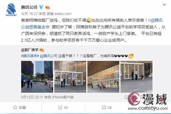 对此,腾讯公司也在官微进行了回应:“谢谢阿姨给鹅厂送鸡,但我们收不得也在此向所有捐助人表示感谢!”