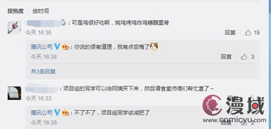 有网友积极献策:“收下吧!非常朴实了”“项目组的同学可以给阿姨买下来,然后请食堂师傅们帮忙煮了~”腾讯回复“不了不了,项目组同学该减肥了”。
