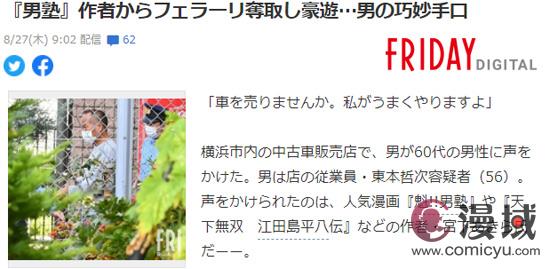 8月27日据日媒报道,著名热血漫画《魁男塾》的作者宫下亚喜罗的座驾、价值高达3300万日元(215万人民币)的法拉利超跑被一名骗子骗走,引发网友热议。