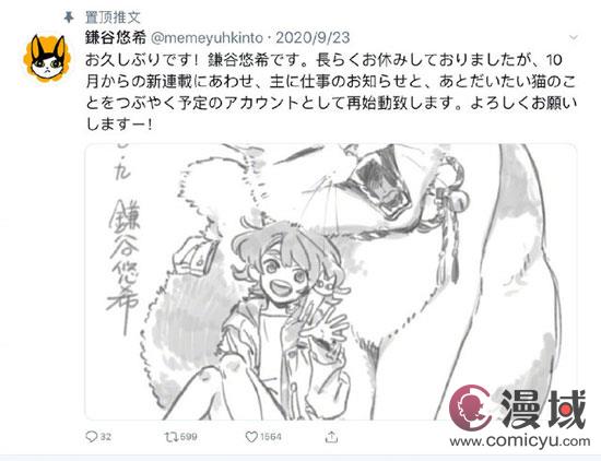鎌谷悠希:“大家好久不见!休息了很久之后将在10月开始新连载,请多指教!”