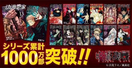 集英社在10月29日宣布了在《周刊少年Jump》上连载的人气漫画《咒术回战》,漫画系列累计突破1000万部(含电子版)的消息。本作之前发售的13卷全部重版,与去年11月宣布动画化消息时的250万部相比,增长了4倍之多。