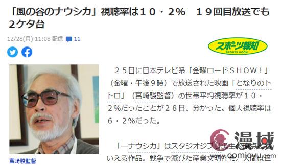 12月28日据媒体报道,宫崎骏的动画电影名作《风之谷》于25日第19次登陆TV,今天收视率统计出炉,平均家庭收视率高达10.2%,引发业界惊叹,毕竟是36年前的老动画电影。