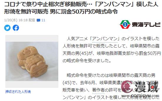 岐阜市一名45岁男性涉嫌在去年6月使用移动贩卖车,未经版权许可制作销售《面包超人》主角形象点心,被举报后遭到警方查处,近日判决下达罚款50万日元。