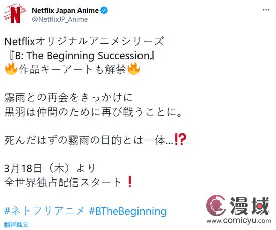 2月18日,网飞动画官方公布了《B:起点Succession》主视觉图和预告影像,该作将于2021年3月18日全球放送,网飞独家播映。