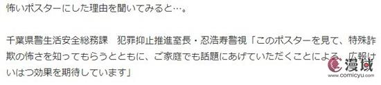 针对民众对于这幅作品过于惊悚的质疑,千叶警方回复称希望传达诈骗的可怕度的同时成为家家议论的话题,以达到宣传的目的。