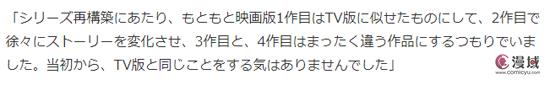 EVA剧场版4部作是对1995~1996年播出的原创TV动画版的再构建,实际上第一部几乎与TV版完全雷同,第二部故事开始发生变化,到第3部以及近日上映的第四部时,已成为完全不同的作品,已经找不到当年TV版的影子了。
