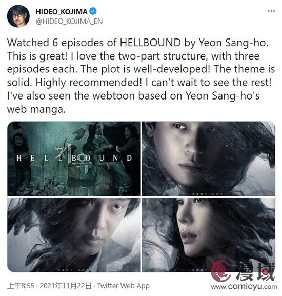 由《釜山行》导演延相昊执导的Netflix惊悚新剧《地狱公使》已于11月19日播出全部6集。11月22日,著名游戏制作人小岛秀夫发推大赞《地狱公使》称,本剧的主题非常硬核,强烈推荐。