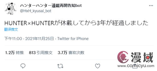 根据《全职猎人》休刊统计推特@HxH_kyusai_bot的记录,《全职猎人》已经停刊整3年了。