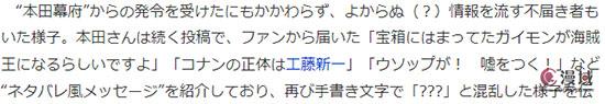 据悉或许是因为《海贼王》最新1044话将揭晓重要情报,引发本田翼“恐慌”,粉丝们哭笑不得之余,“听不听令”那得另说,显然更多粉丝更乐意气气本田翼,各种奇葩回复都来了,比如“卡在宝箱里的卡蒙好象是海贼王!”,“柯南其实是工藤新一”,“乌索普又撒谎了!”等等。
