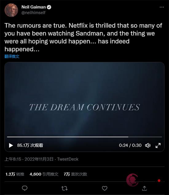 盖曼在推特上说道:“谣言是真的。网飞很高兴你们中的许多人一直在观看《睡魔》,而我们都希望发生的事情……确实发生了……”