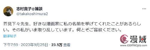 近日,《青之花》《放浪男孩》的作者,漫画家志村贵子就发推表示,“芥见下下老师,好像曾经在列举喜欢的漫画家时提到过我的名字。我现在感到非常心烦意乱,请原谅我。”